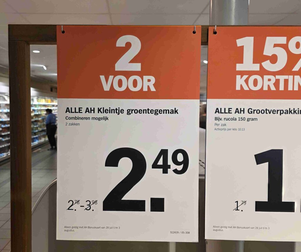 600 gram voor € 1,59 en je krijgt de melding je mist bonus. Het bordje dat niet leesbaar is zegt 2 voor € 2,49 dus 1,2 kilo.