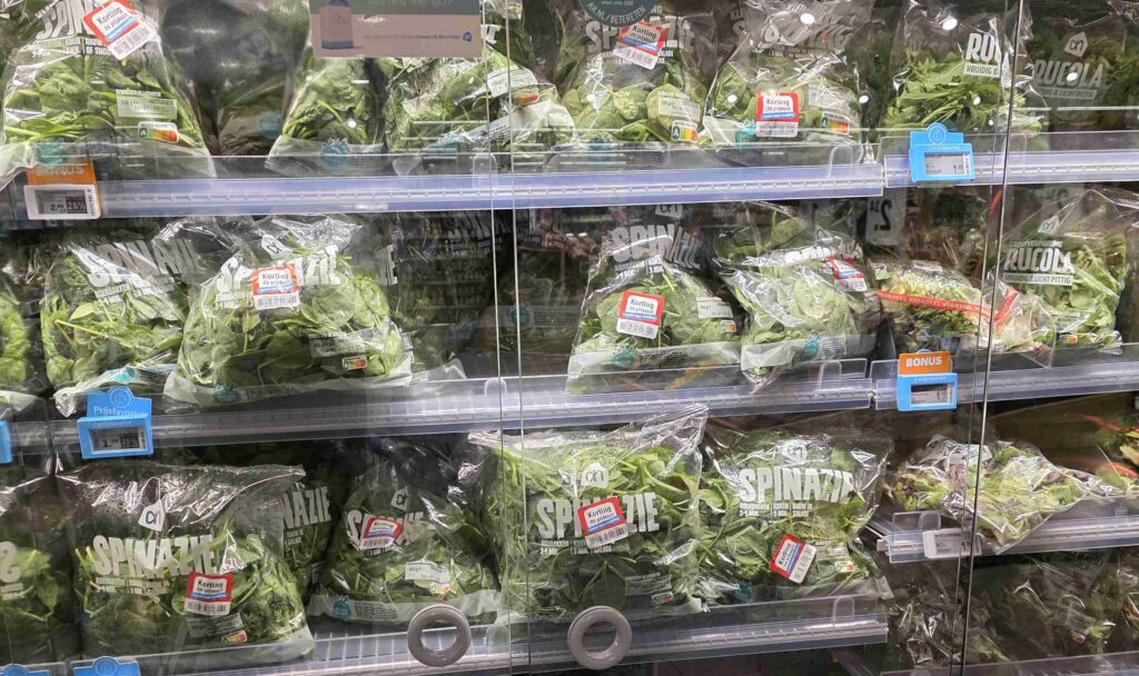 In de koelvitrine ziet u talloze zakken spinazie van 400 gram met een kortingsstikker van 35%.