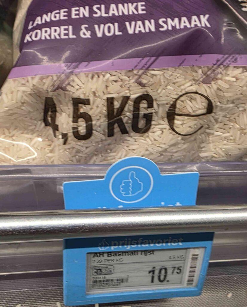 normale verpakking van 1 kilogram en grootverpakking van 4,5 kilogram. Ja het klopt, grootverpakking is goedkoper dan de kiloverpakking. het scheelt maar liefst een halve cent!