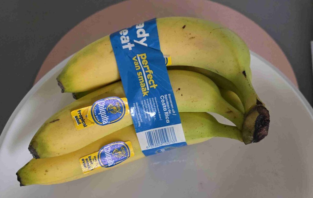 Deze bananen waren gisteren nog hartstikke groen met de stikker ready to eat. Maar waar komen deze bananen (stickers) dan vandaan? Komen die speciaal uit Engeland? Ready toe at is immers geen Nederlands. En andere bananen die in mijn bonus box zaten die waren er niet dus dan maar de wat duurdere bananen zodat ik gewoon in bed mag slapen GRRRRR.