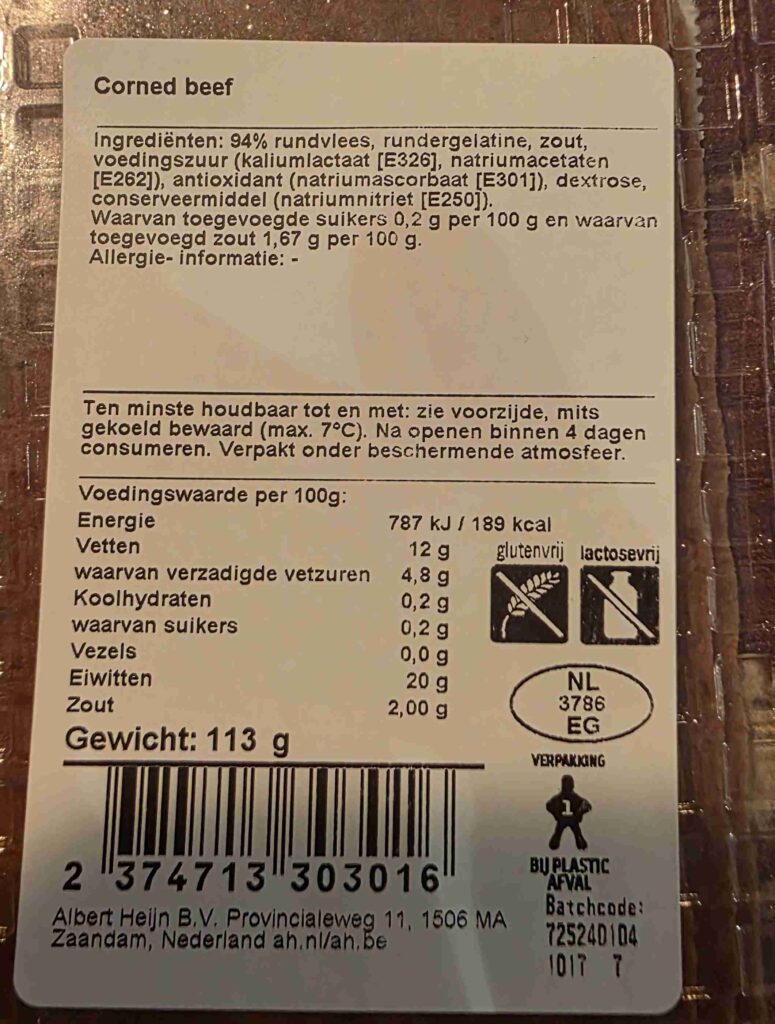Dan heb ik nog de cornedbeef die niet goed smaakt en nog steeds op advies van de Voedsel en Waren Autoriteit in mijn diepvriezer ligt. Zowel de Voedsel en Waren Autoriteit als Albert Heijn neemt niet de moeite om het product te onderzoeken.