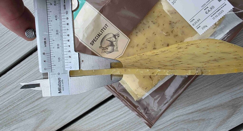 wat mag je verwachten van 235 gram kaas? Zes of zeven plakjes? Nee, vier plakken waarvan twee met een dikte van 4,25 mm. Dit is nu net zo iets als krimpflatie. Snel op zodat je snel weer nieuw koopt. Zelf houd ik wel van dik beleg, maar dit is zwaar overdreven. En voor mensen die het niet zo breed hebben en alles moeten berekenen een flinke aanslag op de kleine portemonnee.